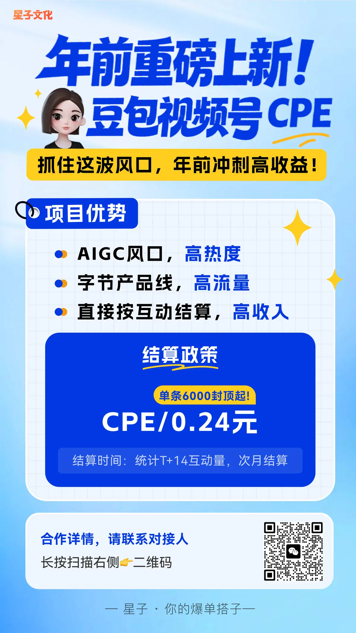 别慌!你的爆单搭子「星子文化」,年前直接扔出重磅福利——豆包视频号CPE项目全新上线!踩中AIGC+字节流量双风口,互动就能拿钱,单条收益6000元封顶起,年前冲刺高收益,这波车赶紧上!