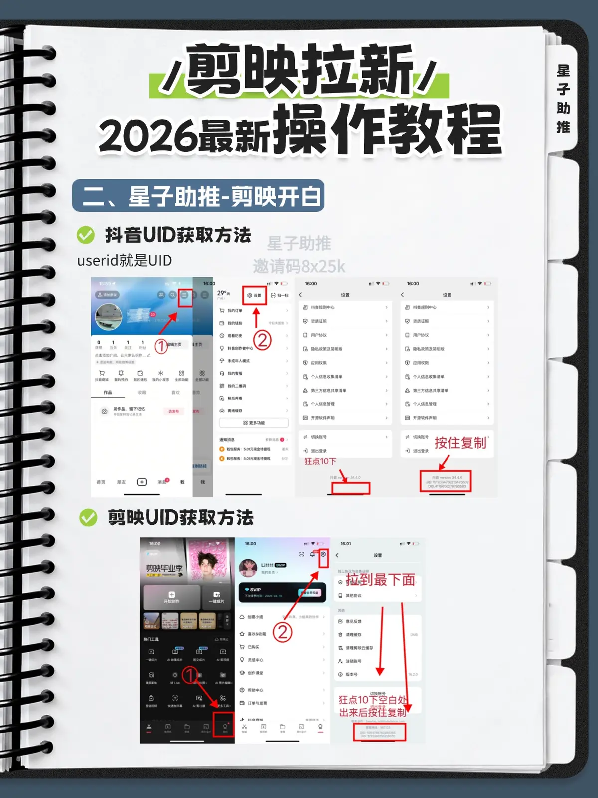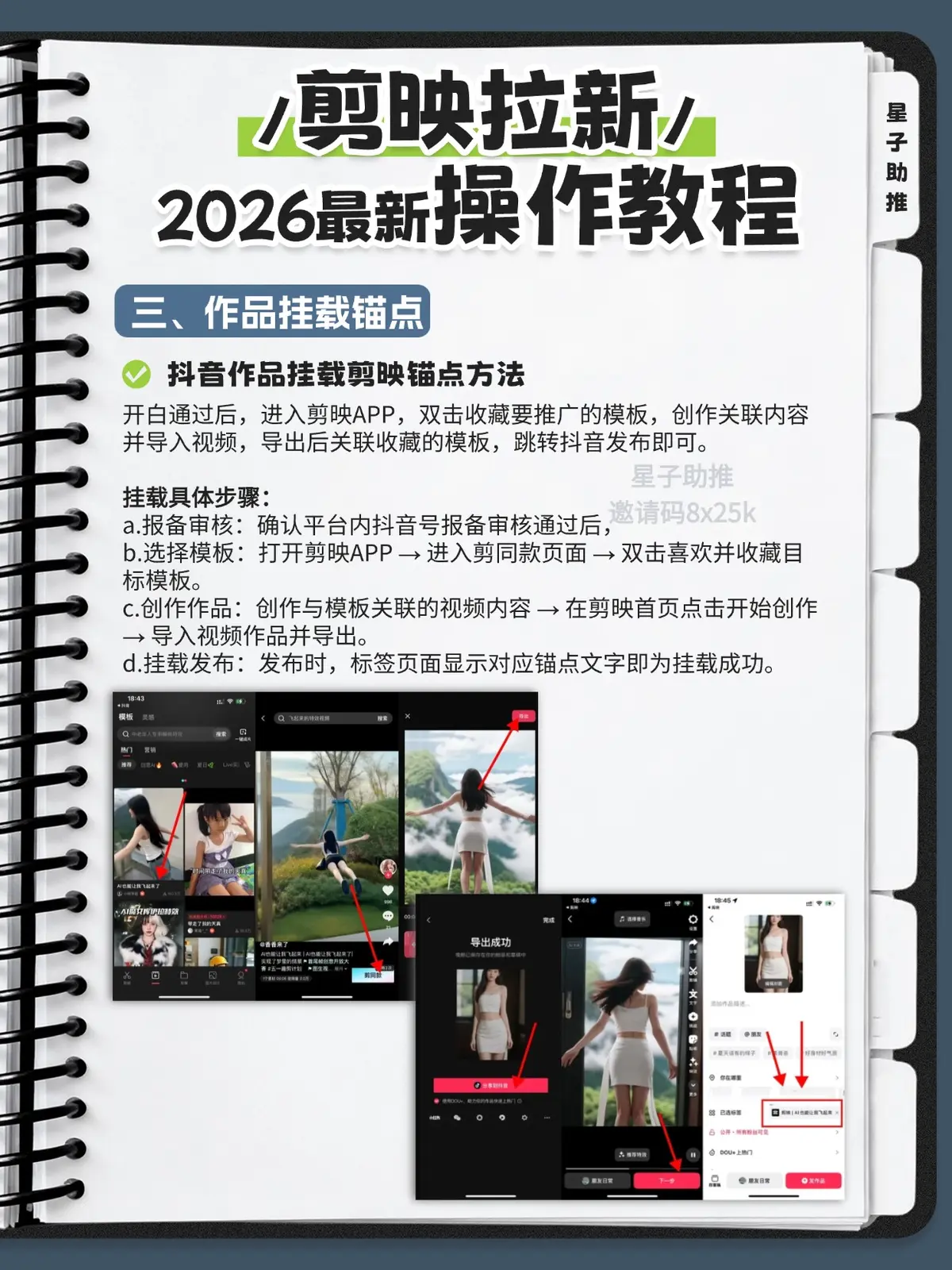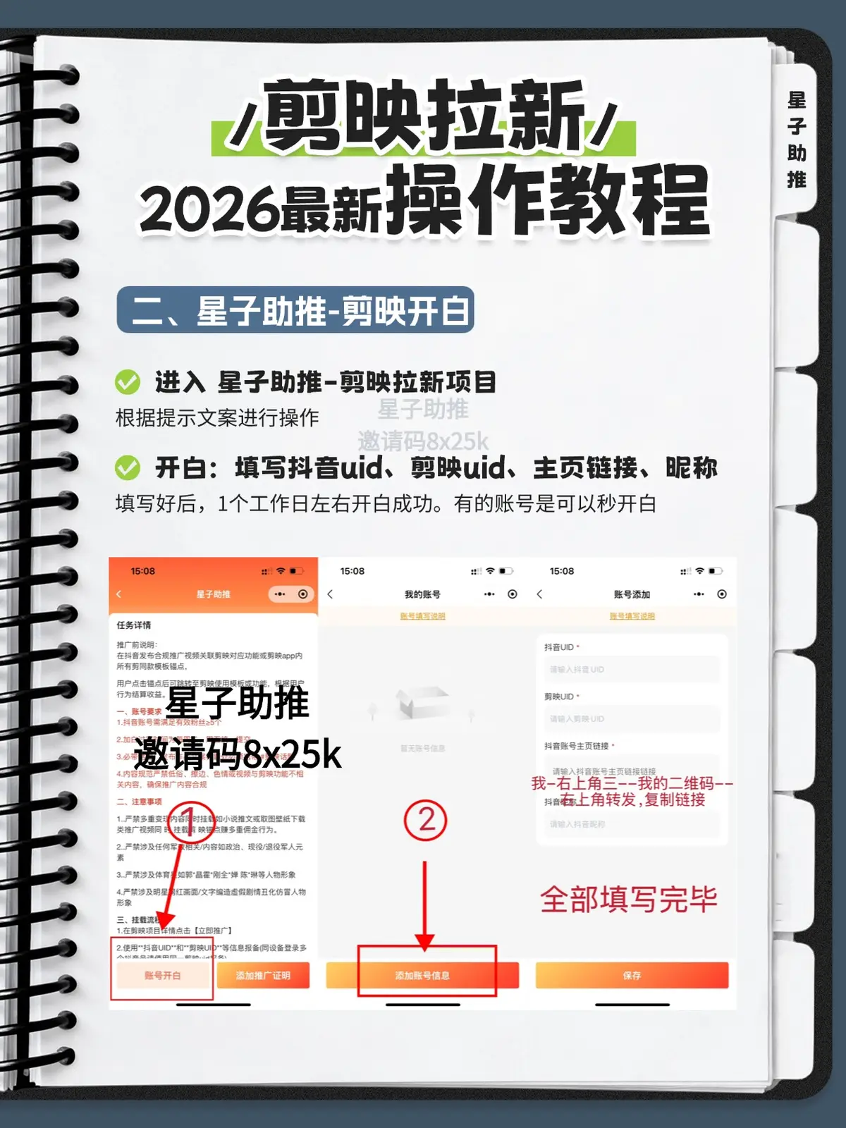 2026剪映拉新推广项目如何做?星子助推最新的手把手操作流程,一定要按照图中提示进行操作哦!✅适合抖音账号赛道:小说推文、灵魂画手、画一个故事、手势舞、猫meme等流量不错的抖音账号,挂载锚点直接可以实现账号变现星子助推官方邀请码8x25k✅星子助推-剪映整体流程:【点击进入】完整版 2026剪映推广赚钱拉新流程1、申请开白(填写剪映UID、抖音UID等信息,秒开白)2、通过剪映/抖音进行锚...