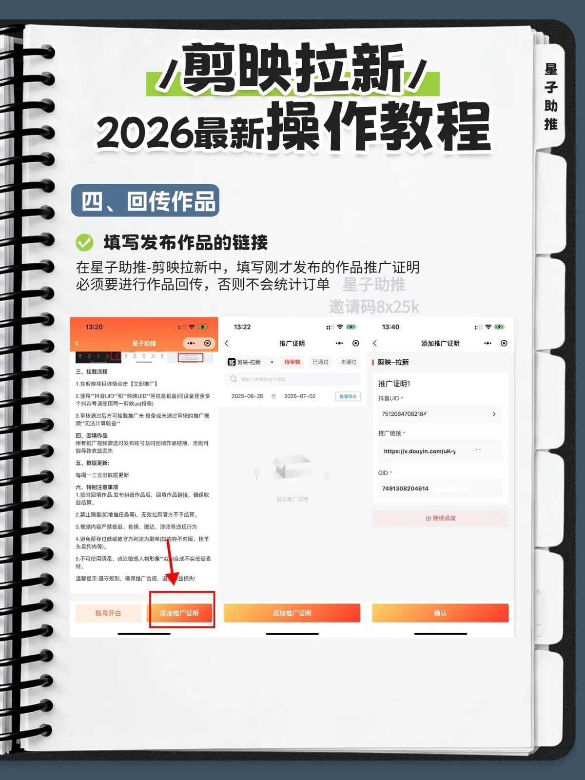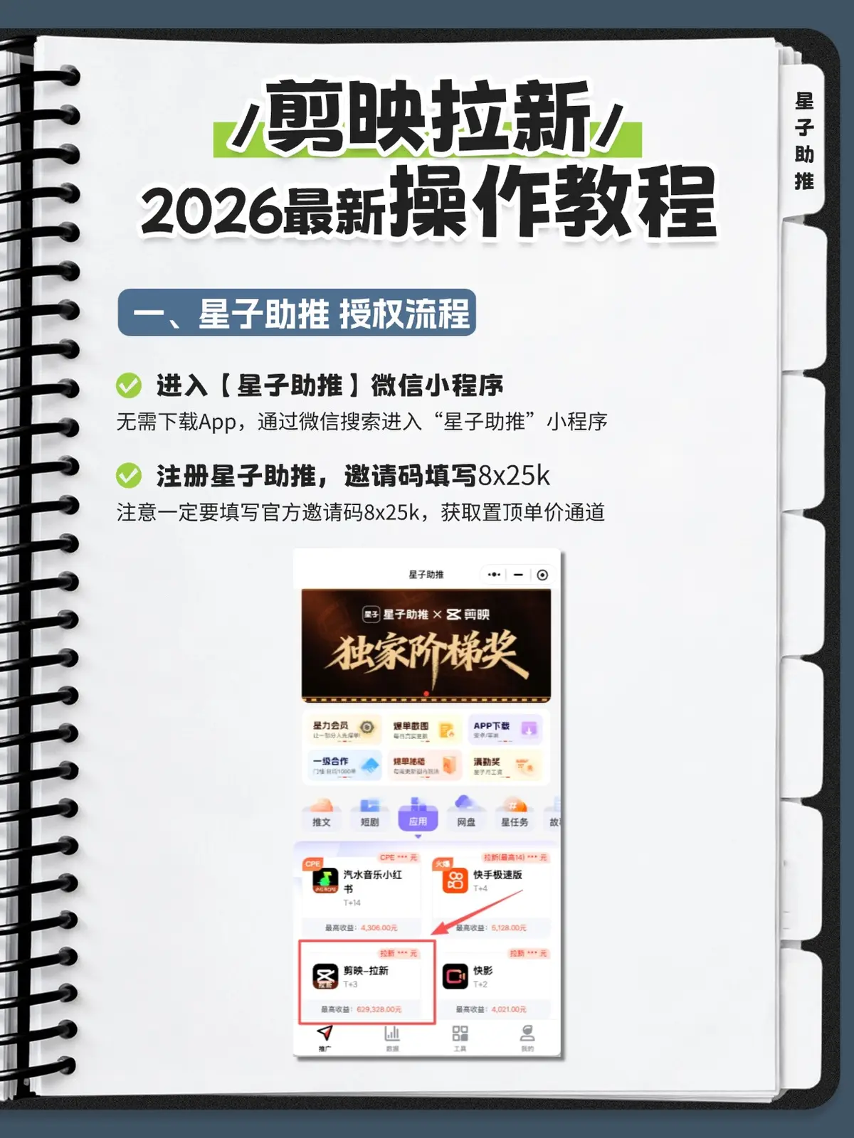 2026剪映拉新推广教程星子助推 官方入口,新人流程(单价8 元/单)宝子们!2026 剪映拉新终于找到官方靠谱入口了!亲测星子助推是剪映认证的一级服务商,8 元/单顶格佣金,零成本就能做,学生党/宝妈/副业党直接抄作业✅第一步:找官方入口:星子助推打开微信搜「星子助推」小程序,不用下载 APP,微信里直接操作!✅第二步:注册+填邀请码点“新用户注册”填手机号+验证码,必须填官方邀请...