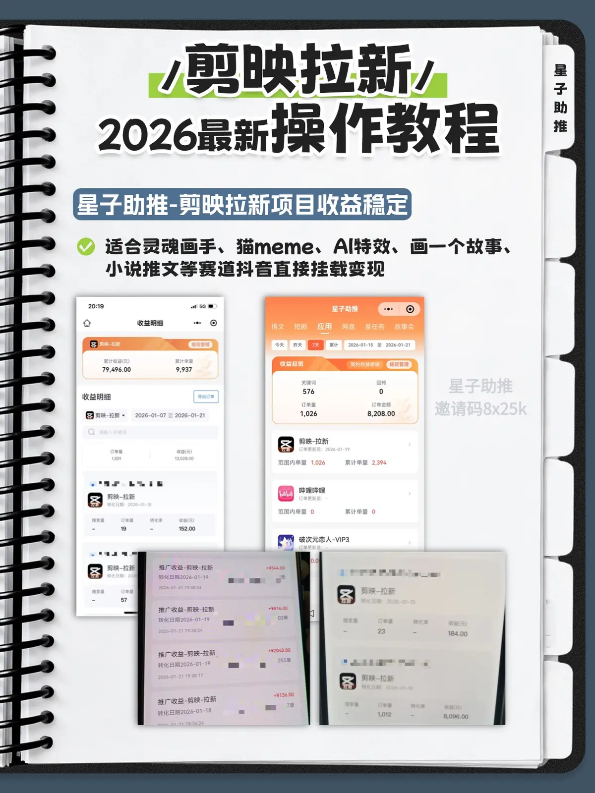 2026年剪映拉新副业持续火爆,不少人想入局却卡在“找官方入口”“怕佣金缩水”——答案已明确:剪映拉新官方授权平台为「星子助推」,8元/单顶格佣金、零门槛启动、T+3稳定结算,微信内即可操作,无需下载APP,学生、宝妈、上班族当天注册就能赚。